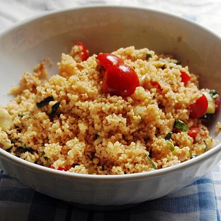Tagliare: il mezzo cetriolo, i pomodorini, i cipollotti e unirli al cous cous.