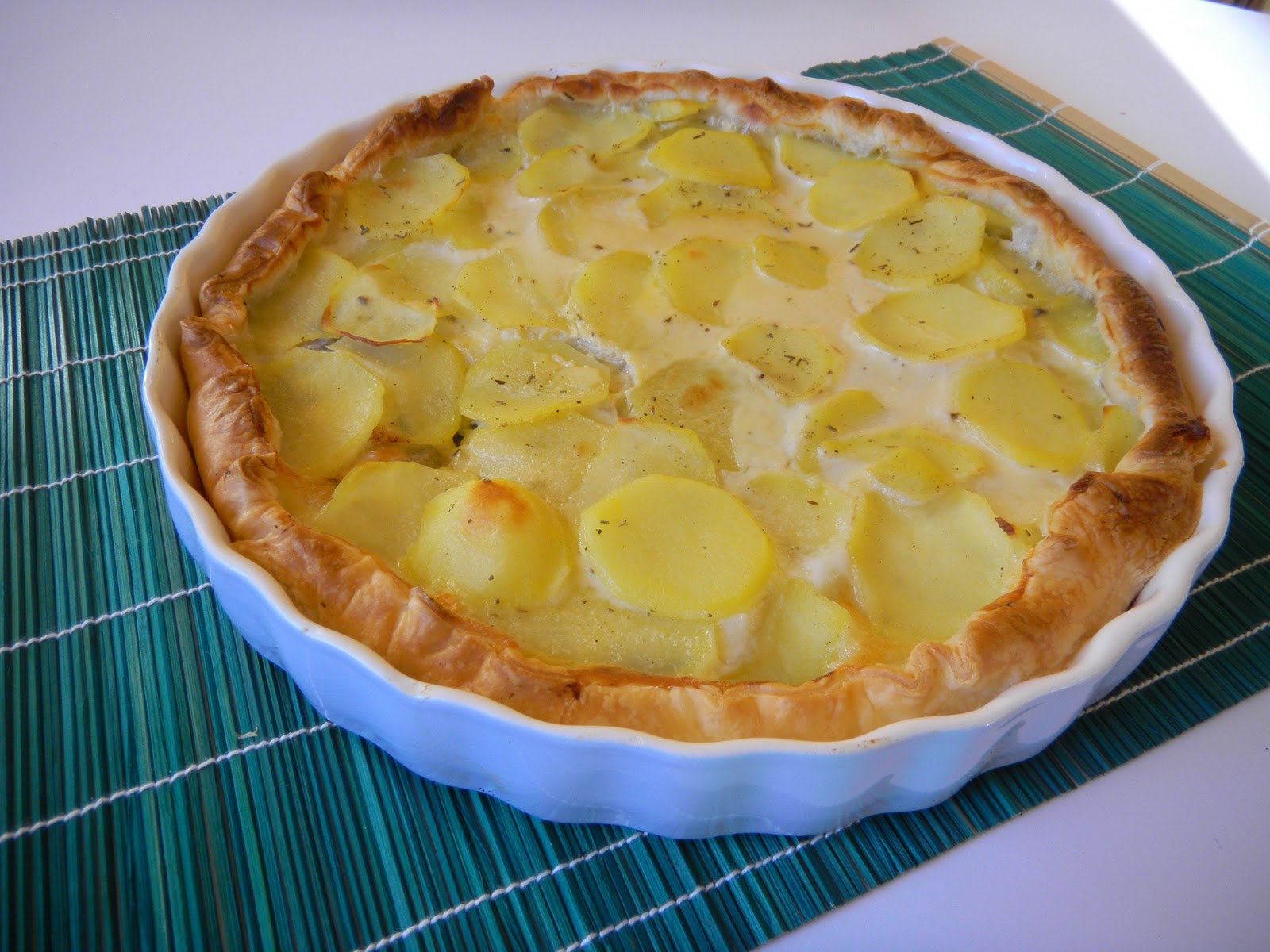 far fondere il burro. imburrare una teglia da torta. disporre sul fondo meta' delle patate, bagnandole bene nel burro fuso. farcire con cipolle e formaggio e ricoprire con le altre patate, sempre bagnando di burro.