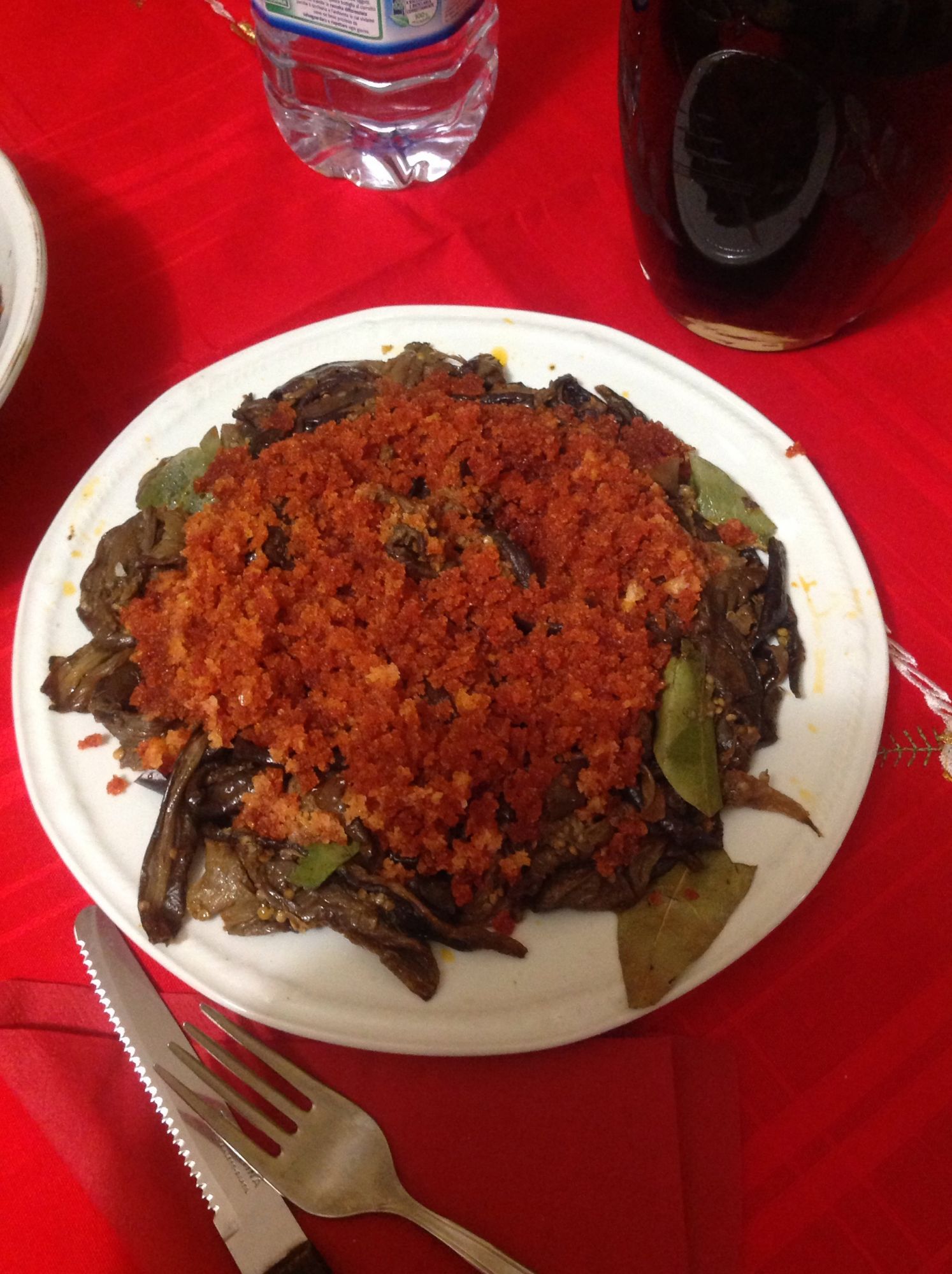 Impiattare alternando uno strato di melanzane e uno di mollica.