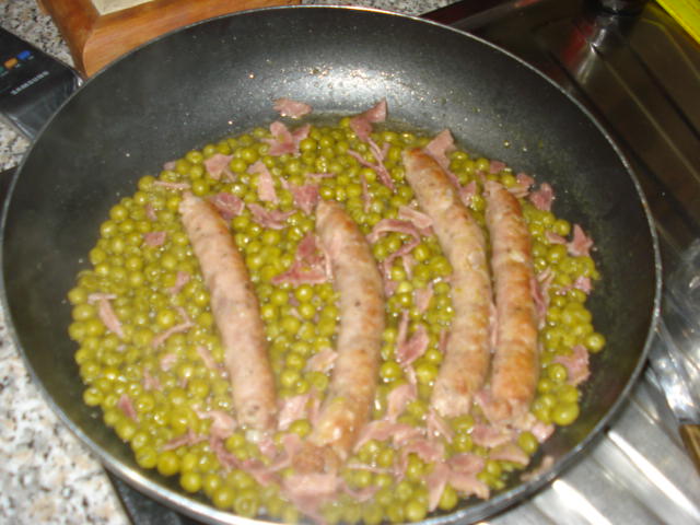 Friggere la salsiccia.Versarci i piselli e il prosciutto tagliato a pezzetti, mettere il dado, il sale e il pepe.Versare un pò d'acqua e far cuocere fino a far evaporare tutta l'acqua!