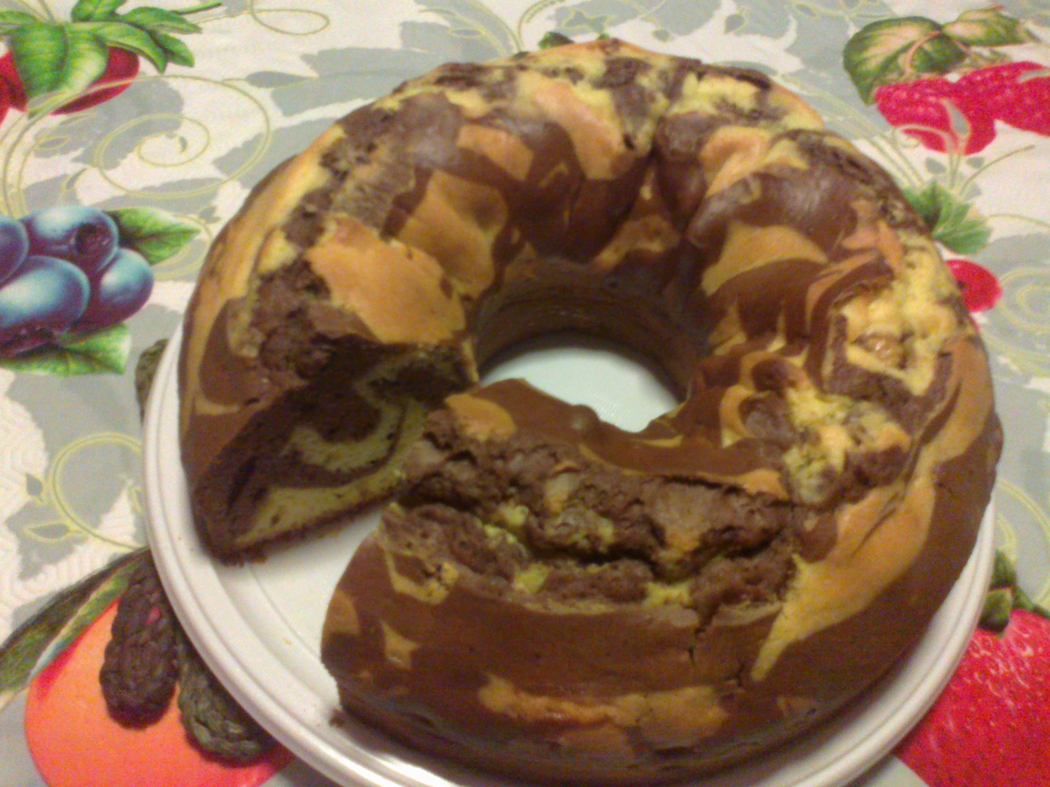 Sbattere le uova con lo zucchero, unire l'olio, il sale, il latte, l'aroma, il lievito e la farina. Amalgamare molto bene e dividere il composto ottenuto in 2 parti uguali. Su di una metà aggiungere il cacao e mescolare, nell'altra metà nulla. Imburrare ed infarinare uno stampo a ciambella (28-30 cm di diametro), versare metà di ognuno dei 2 composti alternandoli, inzuppare leggermente gli amaretti nel caffè caldo e sistemarli al centro sopra il composto formando 2 cerchi. Coprire col composto rimanente sempre alternando il chiaro e lo scuro. Infornate a 180 gradi per 45 minuti facendo la prova stecchino. Lasciar raffreddare e sformare.