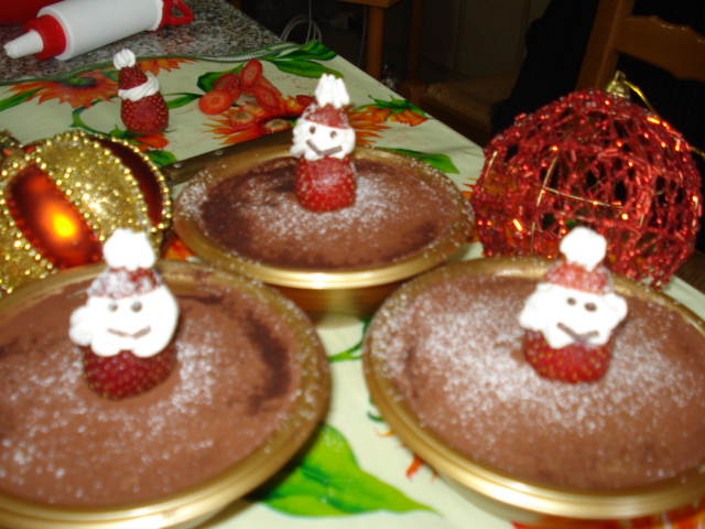 Lavorare la ricotta con lo zucchero.Montare a neve gli albumi, unirli alla ricotta con lo zucchero, aggiungere il latte,tagliuzzare le fragole( lasciandone qualcuna intera per fare a Babbo Natale!) e mescolare il tutto.Versare la crema nelle ciotoline. Spolverizzare con il cacao.Tagliare le fragole rimaste a metà.Montare la panna e con la siringa per dolci mettere un pò di panna su metà fragola e mettere sopra l'altro pezzetto di fragola.Fare un ciuffetto di panna sulla punta della fragola, fare gli occhi e la bocca con le palline di cioccolato e la codetta.Mettere i Babbi Natale sulla crema e mettere in frigo per un'oretta di di servirli. Dopo di ciò spolverizzare di zucchero a velo!