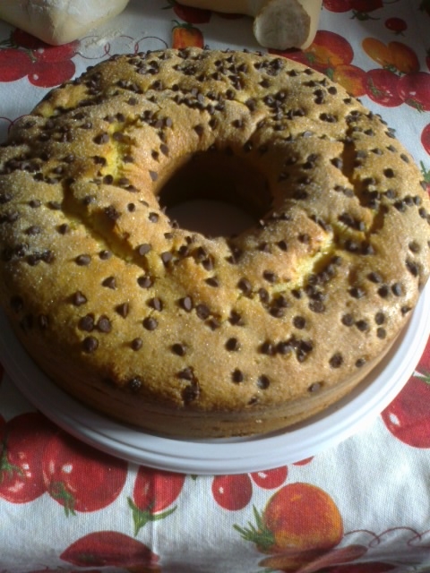 Preparare l'impasto: sbattere le uova con lo zucchero, aggiungere l'olio, il latte ed il sale. Mescolare bene. Poi unire la farina con il lievito, la vanillina ed il cacao. Amalgamare bene. Ora preparare la crema: mescolare i tuorli con lo zucchero, poi versare il latte, la frumina setacciata e l'aroma. Porre sul fuoco mescolando continuamente fino a che il composto si sarà addensato. Imburrare ed infarinare uno stampo a ciambella, versare metà dell'impasto, versare sopra tutta le crema e ricoprire con l'impasto restante. Cospargere con le gocce di cioccolato ed un po' di zucchero semolato per creare la crosticina sulla superficie. Infornare a 180 gradi per 40-45 minuti. Lasciar raffreddare e poi sformare.