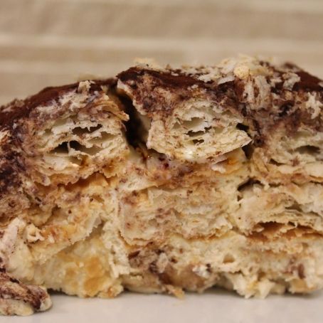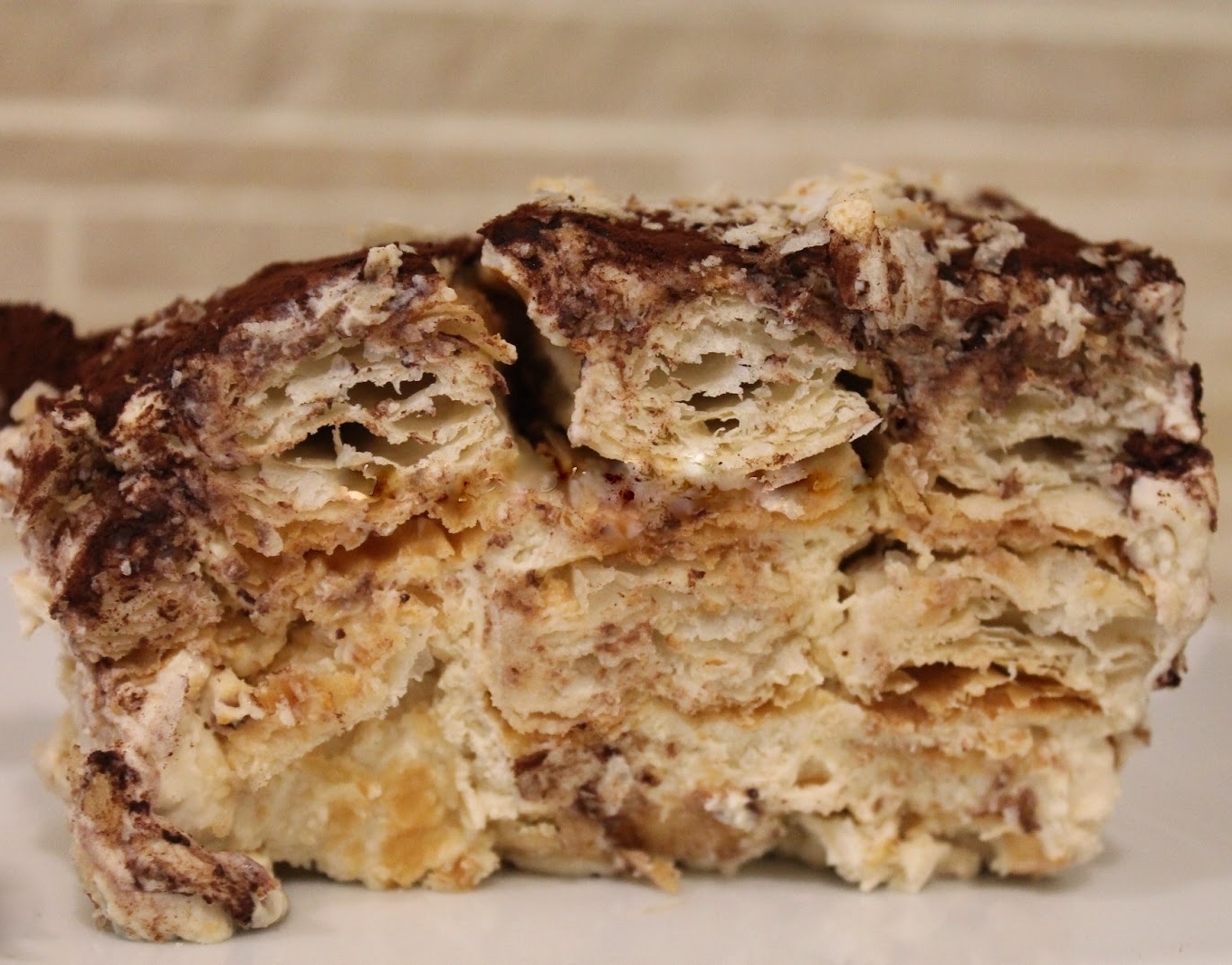 Montare la panna e tener da parte. Sbattere il tuorlo con lo zucchero aggiungendone un cucchiaio alla volta. Quando si sarà formata una crema, unire il caffè freddo e farlo assorbire al composto. Incorporare il mascarpone anch'esso da frigo, amalgamare ed unire la panna montata mescolando bene con movimenti dal basso verso l'alto per non smontare il composto. Iniziare a comporre il tiramisù: foderare una pirofila rettangolare con le sfogliatine, ricoprire la superficie con la crema , spolverizzare con il cacao amaro in polvere e continuare così fino ad esaurimento degli ingredienti. Coprire con carta d'alluminio e porre in frigo alcune ore.