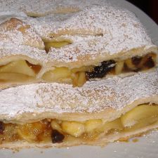 Ora arrotolare il tutto facendo attenzione a non rompere la sfoglia. Appoggiare lo strudel su una teglia da forno ricoperta di cartaforno, spennellarlo con un goccio di latte o del tuorlo d'uovo. Infornare a 180° in forno caldo, per 50 minuti... lasciare raffreddare e servire già tagliato e spolverato di zucchero a velo