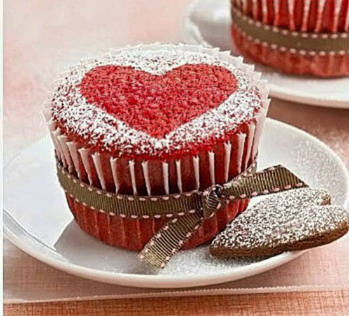 Quando i cup cake sono freddi, tagliateli a metà nel senso orizzontale e farciteli con un generoso strato di crema. Ricomponete i cup cake e decorateli conlo zucchero a velo e uno stencil a forma di cuore.