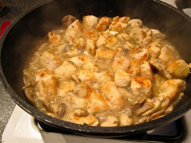 Friggere lo zenzero a fettine. Appena si colorisce aggiungere il pollo, poi la cipolla, lo zenzero tritato e i funghi scolati. Lasciar cuocere.