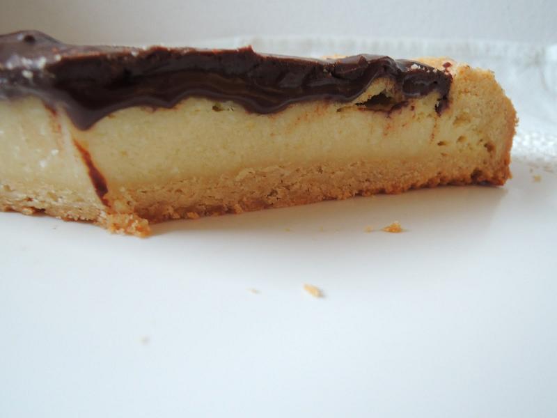 Sciogliere il cioccolato a bagnomaria, e aggiungere la panna. Stendere sulla superficie della torta e livellare con una spatola.