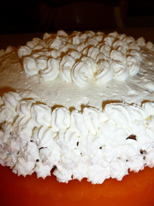 Distribuire la panna montata e livellarla bene sopra e intorno alla torta. Poi decorare a piacere.