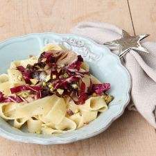 Per prima cosa preparate l'impasto dei ravioli, quindi disponete la farina a fontana sul piano di lavoro e al centro aggiungete le uova, un pizzico di sale e un filo d'olio. Impastate bene gli ingredienti fino ad ottenere un composto omogeneo, poi formate un panetto che dovrete mettere in una ciotola coperta da un canovaccio e lasciate riposare per 30 minuti. Nel frattempo iniziate a preparare il ripieno. Pulite bene il radicchio, tagliatelo a pezzetti e mettetelo a rosolare in una padella con un po' d'olio. Lasciate che si cuocia per circa 10 minuti e, a cottura ultimata, lasciate intiepidire. Aggiungete in padella la ricotta e il grana grattugiato, salate e pepate e mescolate bene. Ora passate il ripieno nel mixer e tritate tutto fino a quando non otterrete un composto compatto e omogeneo. Stendete abbastanza sottile la pasta dei ravioli e con un bicchiere tondo o un coppapasta formate dei cerchi. Formate delle palline con il ripieno e poggiatele su ogni cerchio che poi piegherete in due a portafogli, ricordandovi di spennellare un po' d'acqua sui bordi per chiudere bene. Con l'aiuto di una forchetta create la dentellatura sul bordo ed infine mettete a cuocerli.