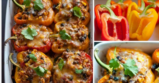 5. Riempire con un cucchiao ogni metà dei peperoni con la miscela di carne e posizionare dentro della pirofila. Cuocete i peperoni per altri 15-20 minuti o fino a quando i peperoni sono ben cotti. Prima di togliere dal forno cospargere ogni peperone con formaggio cheddar grattugiato e rimettere in forno per far grattinare il formaggio.