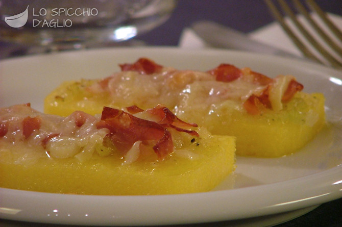 Crostini rustici di polenta allo speck, salsiccia e fontina.