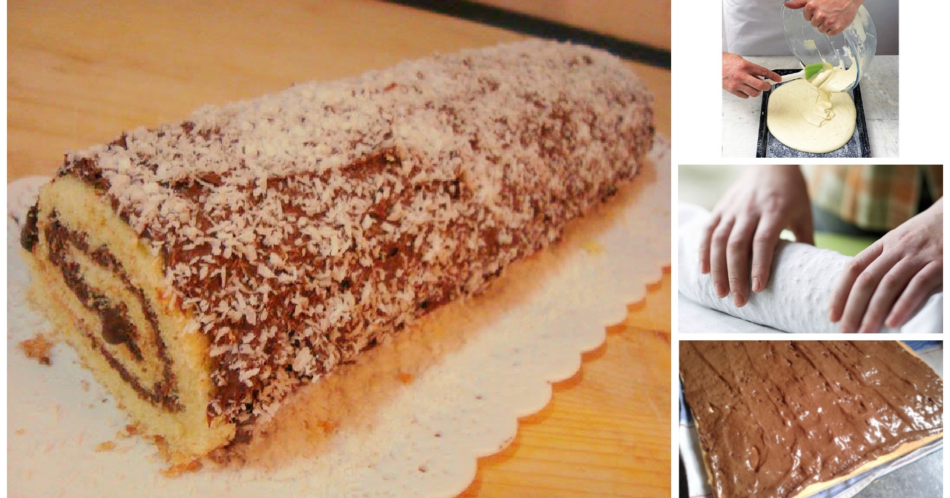 Togliere dal forno e arrotolare, senza togliere la carta da forno, in un canovaccio umido. Lasciare raffreddare. Dopo un’ora srotolare delicatamente, farcire con Nutella e arrotolare senza carta da forno. Decorare con altra Nutella e farina di cocco.