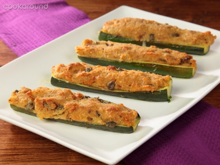 - 8 zucchine medie, 200 g di pane raffermo, 250 g di tonno sott'olio, 1/2 spicchio d'aglio (facoltativo), 2 cucchiai di capperi sott'aceto, 100 g di parmigiano grattugiato, olio extravergine d'oliva, sale