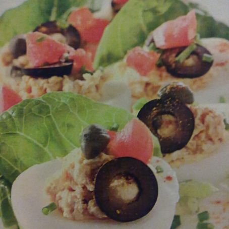 Farcite le uova con la crema al tonno, guarnitele con 1 cappero, 1 o 2 dadini di pomodoro, 1 fettina di oliva e con la rimanente erba cipollina tritata.