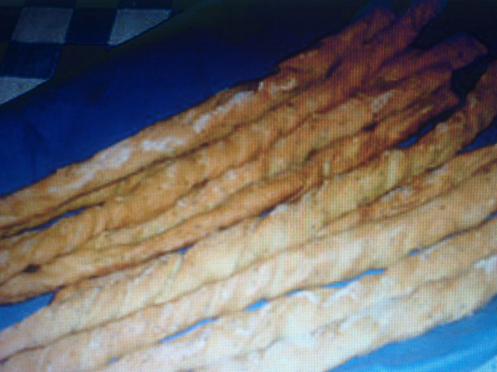 Attorcigliare ogni striscia e posarla sulla teglia da forno coperta di carta da forno, spennellare le strisce con un'emulsione di acqua e poco olio extra vergine.