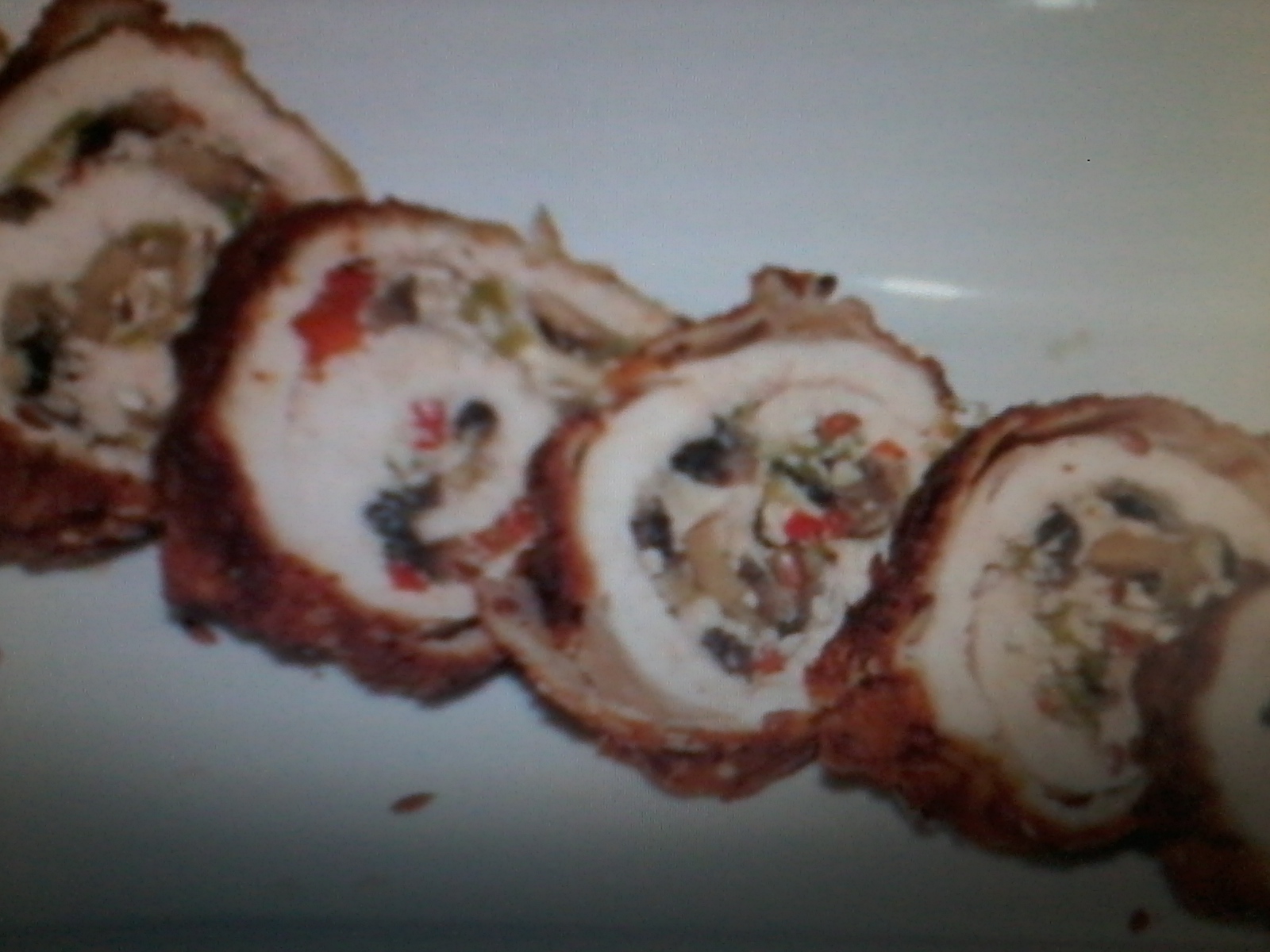 Ill peto di polo si talia fette i si batte fino qhe diventano sotile,sale ,pepe,il chucchiaio di buro si mete in una pentola ,poi dentro si metono li funghi,peperone,cipola tuto taliato a peti.Quando si a rafredato unpo si mete il formaggio,prediamo una feta di peto di polo metiamo due cucchiai de la compozitione poi qudiamo con un stuzzicadenti.In una pentola si mete olio per frigere,il peto cozi rimpieno si pas prima in uovo sbattuto,farina,uovo,pan gratato poi in olio per frigere