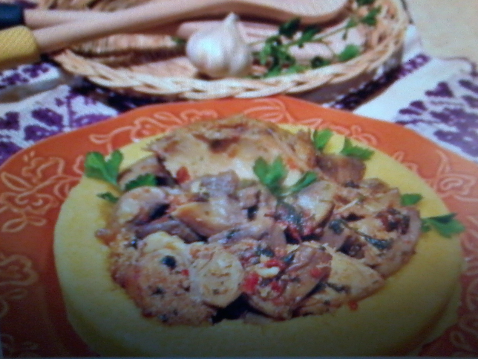 - 1 kg carne di polo,peto i cosce,1 kg funghi,2 cucchiai olio di oliva,2 spicchi di aglio,sale, pepe, 2 cucchiai di pasata di pomodoro,prezemolo.