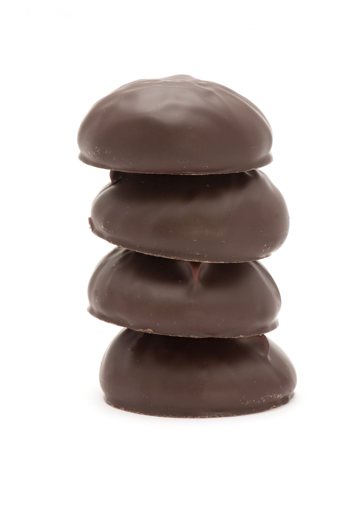 Tagliare i biscotti a metà oppure svuotarli da sotto con l'aiuto di uno scavino e farcirli con la crema all'arancia. Ricomporre i biscotti. Far sciogliere la marmellata di arance a fuoco bassissimo o a bagnomaria, quindi spennellare una piccola quantità di gelatina sulla superficie dei biscotti. Lasciar rapprendere un pò e ricoprirli completamente con una ganache ottenuta facendo fondere il cioccolato fondente nella panna bollente. Lasciare raffreddare fino a che il cioccolato non sarà completamente solidificato.