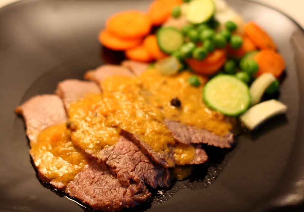 Tagliate a cubetti la verdura e conditela con il cumino e la maggiorana. Quando la carne ha preso un colore dorato da tutte le parti, aggiungete la verdura precedentemente tritata. Lasciate cuocere la carne lentamente per circa un'ora e mezza nel forno, aggiungendo dopo venti minuti la birra. Insaporite alla fine di nuovo con sale, pepe, cumino e maggiorana e servite la carne tagliata a fette contornata dalle verdure.