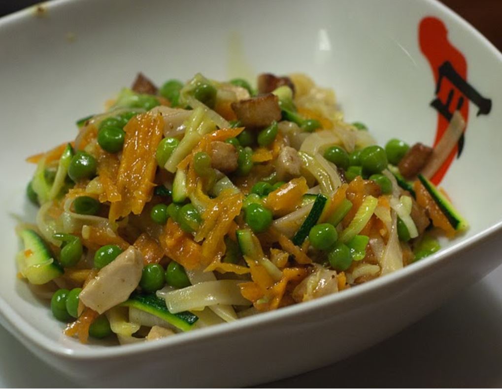 Tagliate i petti di pollo a pezzi e rosolateli per 5-10 minuti in un wok caldo leggermente unto di olio.