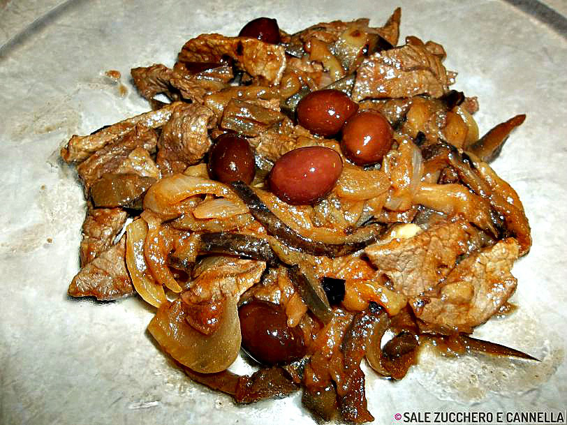 Far cuocere per circa 5 minuti, sfumare con l’aceto, buttarvi le olive – io le avevo caserecce, buonissime! – e la passata di pomodoro; amalgamare e lasciar evaporare un pò l’aceto, aggiungere gli straccetti di cavallo e far cuocere coperto per altri 5-6-minuti. Aggiustare di sale e servire ancora caldo.