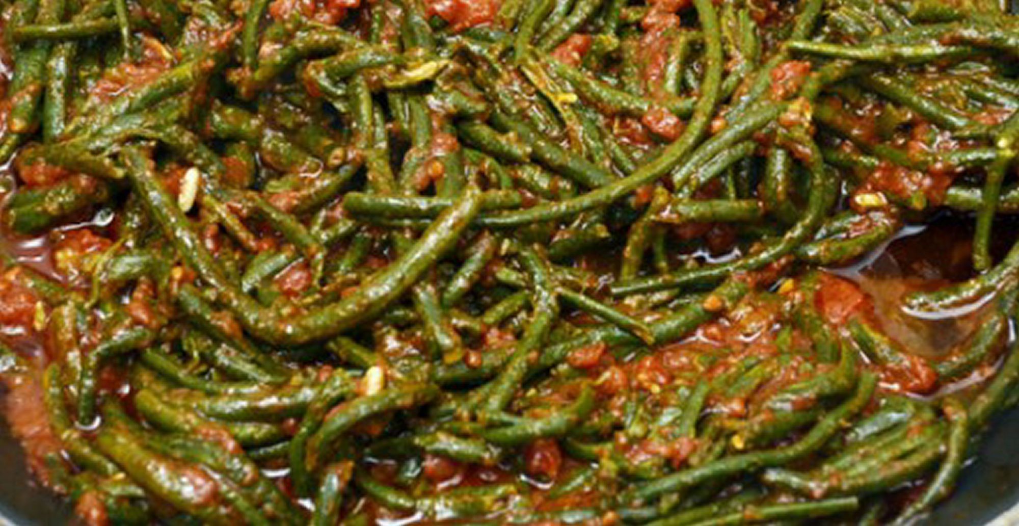 Quando il sugo è pronto aggiungere i fagiolini serpenti. Fare cuocere il tutto coprendo con un coperchio. Quando sono cotti, ma croccanti serviteli tiepidi.
