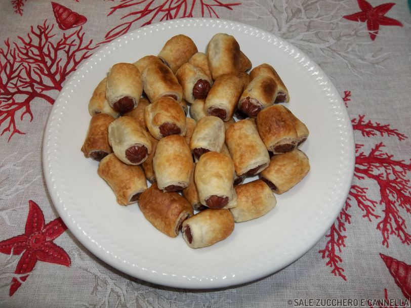Stendere la pasta sfoglia e tagliarla a strisce (larghe più o meno quanto i mini wurstel); formare i mini hot-dog arrotolando la sfoglia intorno ai wurstelini, infornare per circa 10 -15 minuti in forno preriscaldato a 200°.