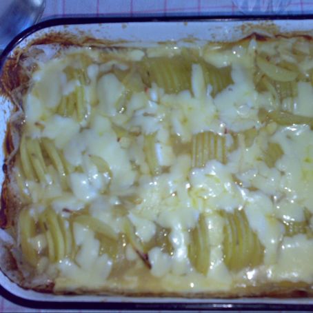 Tagliare a fette una patata e dopo averla ricomposta intera, metterle in una teglia. Procedere allo stesso modo con tutte le patate necessarie a riempire la teglia, foderata con carta da forno.