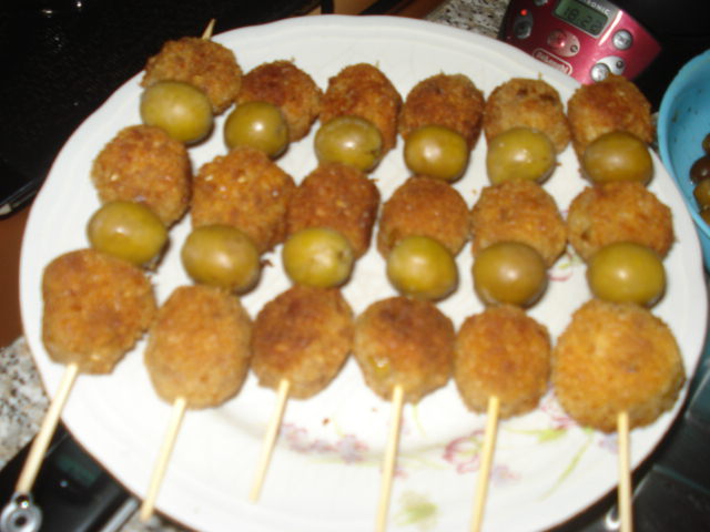 Mettere la carne tritata in una ciotola e aggiungere un uovo, il formaggio grattugiato, la noce moscata grattugiata, un pizzico di sale e un pizzico di pepe.Mescolare bene e aggiungere la scorza del limone grattugiata e metà del succo del limone e alla fine aggiungere metà delle olive verdi tritate finemente e un pò di pan grattugiato.Amalgamare il tutto e formare delle palline.Passarle prima nell'uovo sbattuto e poi nel pan grattato e poi friggerle nell'olio bollente.Dopo di ciò infilzarli negli stecchini lunghi alternando con le rimanenti olive verdi fino a formare degli spiedini