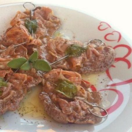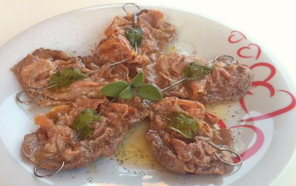 Prendete una fetta di vitello, metteteci sopra una fetta di prosciutto crudo, una foglia di salvia e fermate con uno stuzzicadenti.