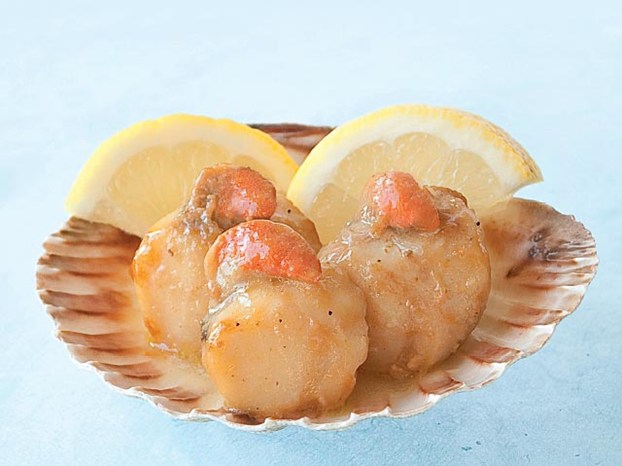 Servire dopo aver ricomposto ciascuna capasanta nelle conchiglie, disponendo due molluschi per ciascuna (valva bianca e valva corallo) e guarnire con fette di limone.