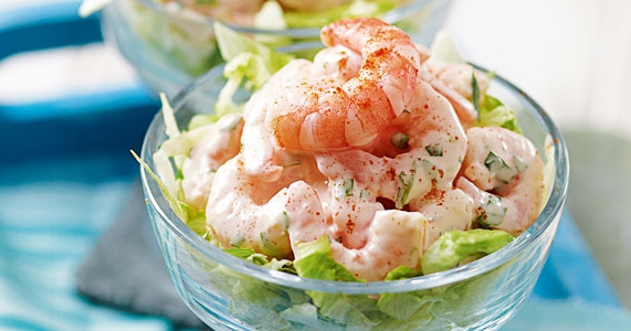 Disporre le striscioline di lattuga dentro le conchiglie e poi aggiungere la salsa coi gamberetti.