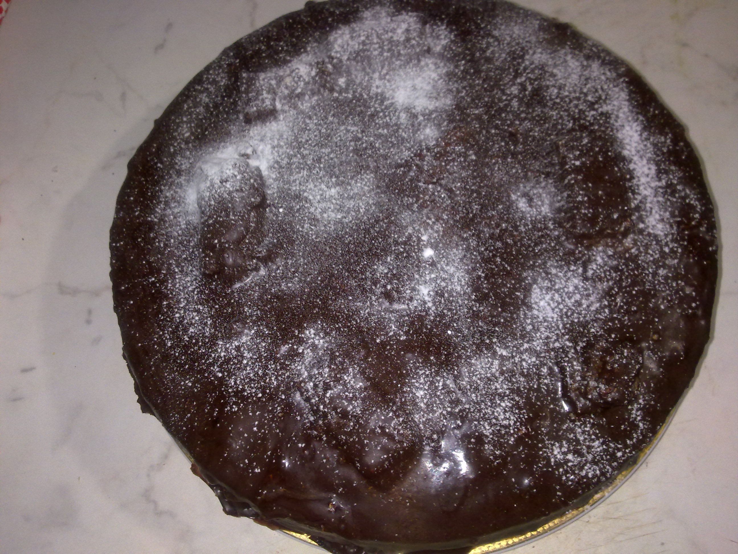 Iniziare a preparare la crema: sbattere le uova con lo zucchero fino a farle diventare una crema, aggiungere la farina e il cacao setacciati ed il latte, versato a filo. Mettere la crema sul fuoco e farla cuocere, mescolando in continuazione per evitare che si formino grumi e quando diventerà densa, spegnere. Con un cucchiaio distribuirla sulla torta ed cuocere nel forno già caldo a 170 gradi per 50 minuti circa. Terminata la cottura, lasciarla raffreddare e spolverarla con dello zucchero a velo.