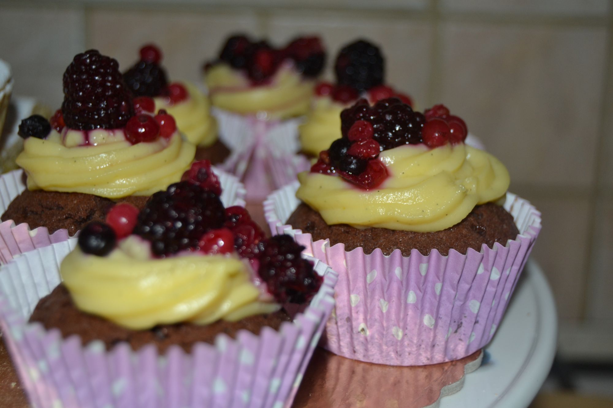 Sfornate, fate raffreddare 5 minuti negli stampi, sformateli e decorateli con la crema pasticcera e frutti di bosco.
