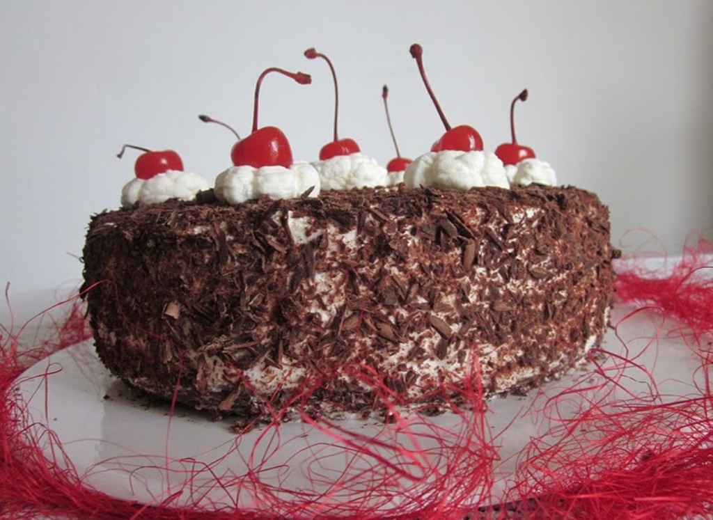 Ricopri la torta con la panna montata e i fiocchi di cioccolato fondente, lascia raffreddare in frigo per un paio d’ore, guarnisci con amarene a piacere prima di servire.