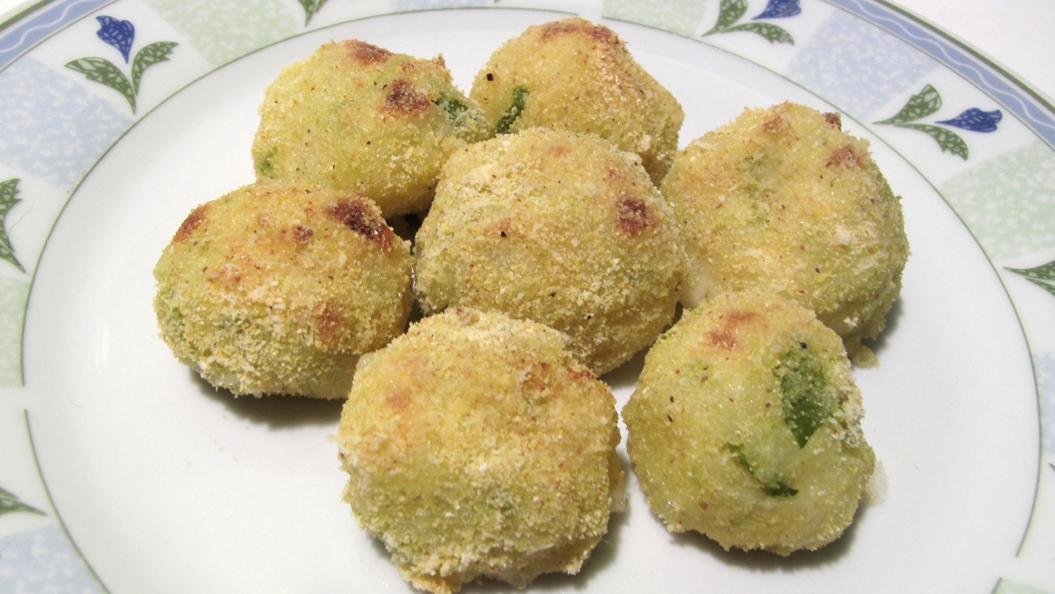 Lessare separatamente le zucchine e la patata. Sbucciare la patata quindi schiacciare con una forchetta o con uno schiacciapatate tutte le verdure e raccoglierle in una terrina. Amalgamare le verdure con il formaggio tritato o tagliato a dadini molto piccoli. Regolare di sale e e formare delle palline. Passare i bocconcini ottenuti in una miscela di farina di mais ( tostata in padella senza grassi per qualche minuto) e formaggio grattugiato. Infornare le palline cosparse con un filo di olio di oliva per pochi minuti a circa 200° utilizzando la funzione grill del forno, finché non saranno dorate quindi servire ben calde.