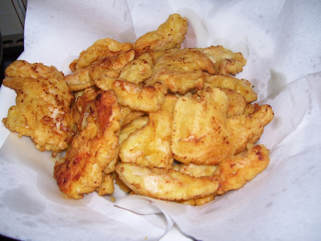Tagliare il petto di pollo a pezzettini. Preparare la pastella mescolando uova, farina, latte, sale, pepe e una grattugiata di limone. Immergere i pezzettini di pollo nella pastella, passarli nel pan grattato. Friggere i pezzetti di pollo in una padellina antiaderente. Sgocciolare e servire le pepite di pollo ancora calde.