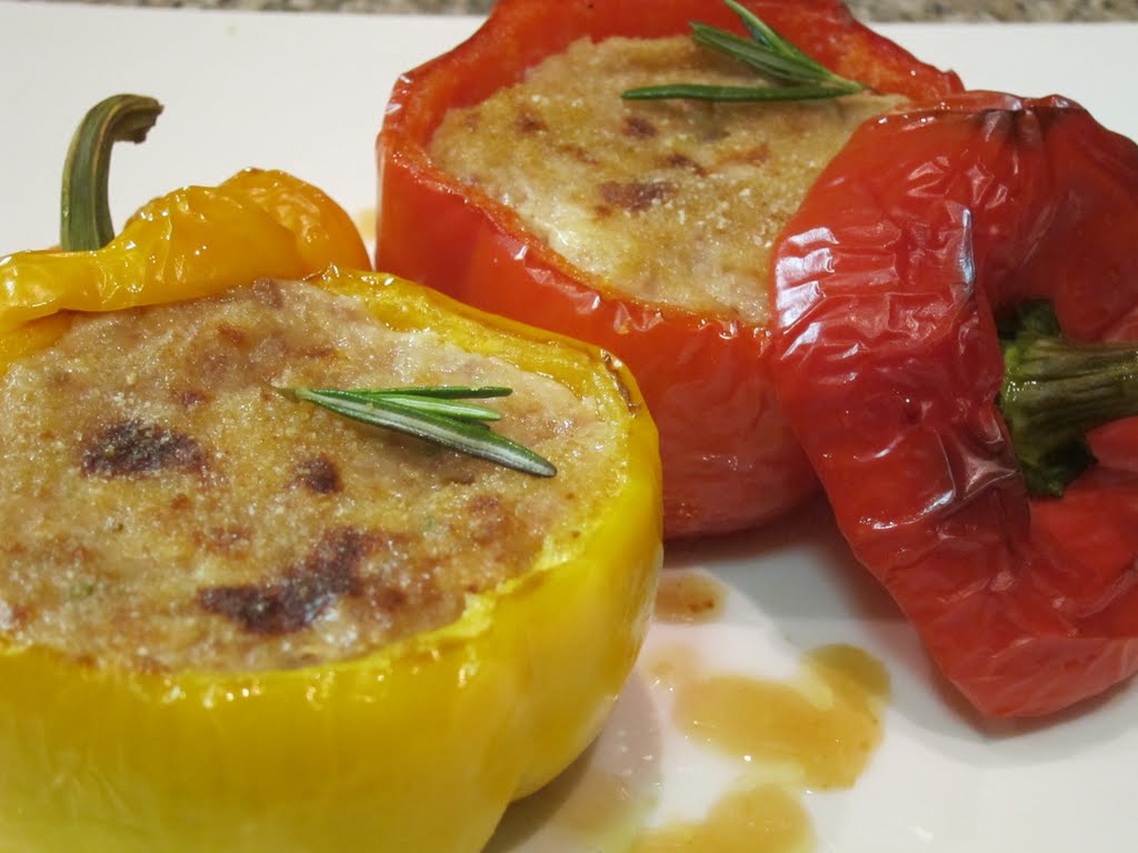 Per questa ricetta conviene acquistare dei peperoni quadrati e non troppo grossi, ideali per essere farciti: poneteli molto ravvicinati in una teglia non troppo larga, in modo che durante la cottura non si rovescino facendo cadere il loro ripieno.