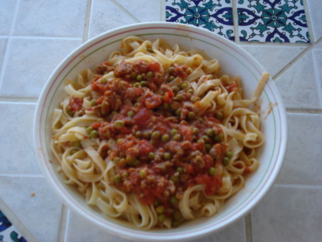 Mettere in una ciotola il tritato, l'uovo, un pizzico di sale, un pò di pepe, una bella manciata di noce moscata, il formaggio grattugiato e mescolare il tutto.Dopo di ciò far friggere il composto e aggiungere i pelati e infine i piselli.Cuocere le lasagne in acqua salata, scolarla e versarla nel sughetto, amalgamare il tutto e servire!