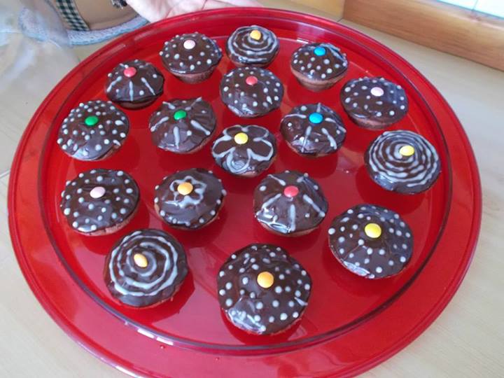 Quando tutti i muffin si sono raffreddati, ho decorato sopra con il cioccolatto messo da parte, ed ho decorato con della glassa all'acqua che ho ottenuto portando ad ebollizione l'acqua e versandola nella ciotola dello zucchero a velo, ho mescolato fino a fare diventare un composto ne troppo duro ne troppo mollo.