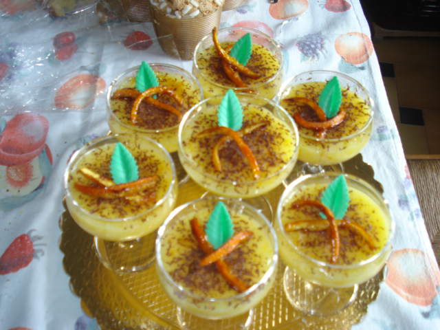 Far scaldare il latte aggiungendo i tuorli, lo zucchero, la farina, la vanillina, il rum e il succo d'arancia.Portare ad ebollizione .Versare dentro le coppe e decorare con il cioccolato grattugiato!
