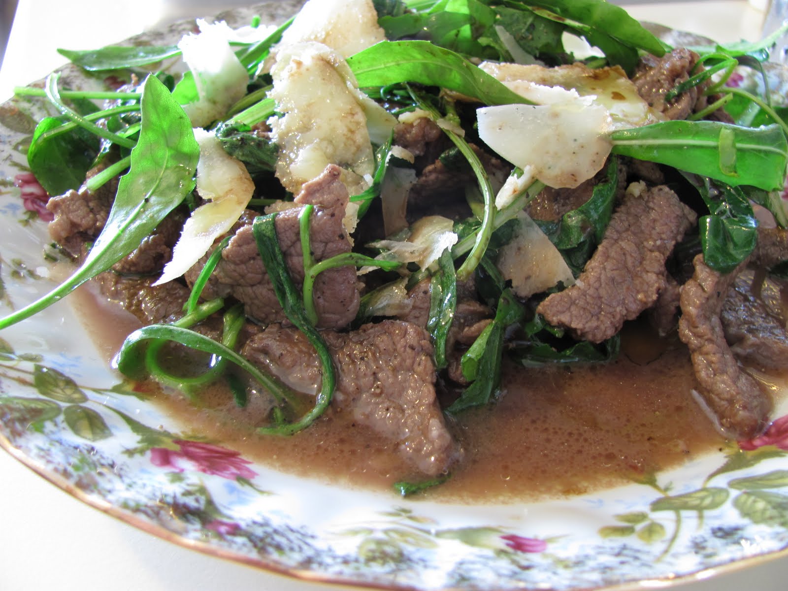 Adagiate gli straccetti caldi, con tutto il condimento, sul piatto con la rucola e il parmigiano reggiano e servite immediatamente.