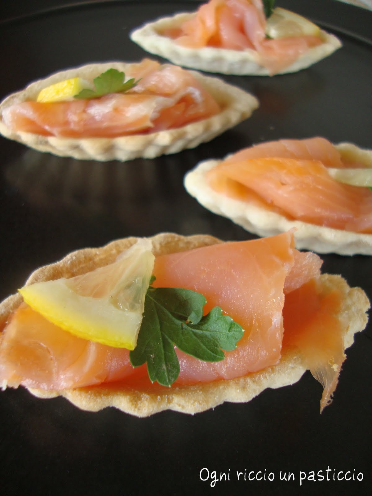 Lavorare bene ed amalgamare la Certosa con olio, sale e erba cipollina; nel frattempo stendere la pasta sfoglia e creare 6-7 tortellette e metterle in una teglia, bucherellarle bene per evitare che durante la cottura si gonfino (e comunque controllare bene e se necessario tirarle fuori e bucherellarle ulteriormente) ed infornarle per 20 minuti circa o comunque finche non si cominciano ad imbrunire. Tirarle fuori ed aspettare qualche minuto che si raffreddino. Quando saranno fredde, metterci sopra la Certosa lavorata e sopra una fettina di salmone. Servire il tutto con il tiepido della tortelletta ed il fresco del formaggio e salmone lavorato insieme.