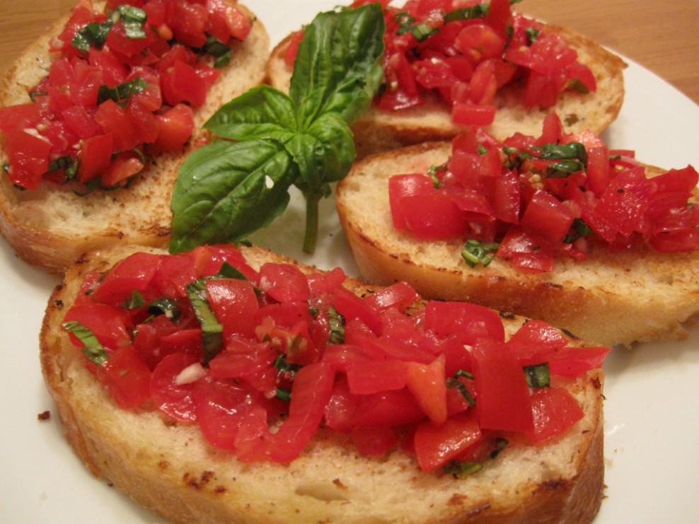 Scegliete un filoncino di pane schiacciato di media larghezza, tagliate otto fette di medio spessore, soffregatele leggermente con uno spicchio d’aglio sbucciato e mettetele in forno preriscaldato a 180°C giusto il tempo perché diventino dorate.