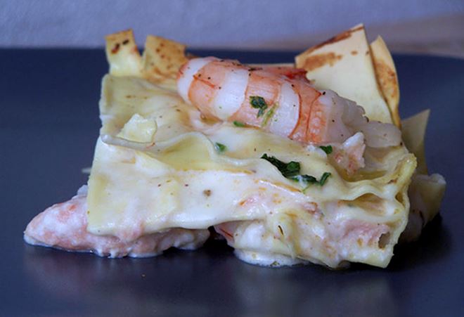 Fare il primo strato di lasagne e coprirle con un po’ di gamberi, polpa di granchio, besciamella e una spruzzata di prezzemolo tritato.