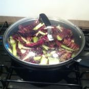 Lavare e asciugare il radicchio, e dopo averlo tagliato grossolanamente a striscioline farlo appassire con la cipolla e olio EVO in una padella antiaderente per almeno 10 minuti.