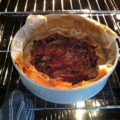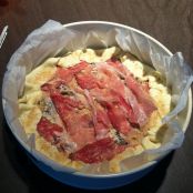 Versare tutto il composto dentro la pasta brisee che avevamo già preparato nella tortiera e cercare di distribuire bene il ripieno e livellare il tutto.