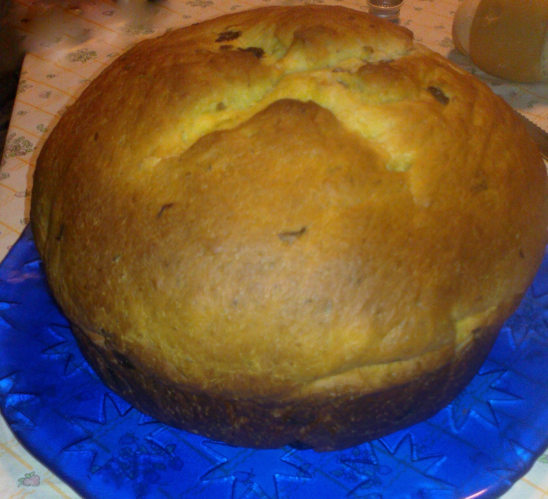 -Ultimazione: una volta lievitato, rimpastarlo su di un piano un po' infarinato e dargli la forma sferica. Posizionarlo così in uno stampo da panettone con la parte liscia verso l'alto e lasciar lievitare coperto fino a che l'impasto arriverà a filo dello stampo (almeno 2 ore). Raggiunto in traguardo, posizionalo in un luogo aerato per 10-15 minuti in maniera che sulla superficie si formi una specie di pellicola più asciutta. Incidere una croce con un coltello affilato a lama liscia ed al centro della croce posizionare una noce di burro. Nella parte inferiore del forno porre una ciotolina d'acqua ed infornare il panettone a 200 gradi per 10-15 minuti, poi abbassare la temperatura a 190 gradi per altri 10-15 minuti, poi abbassare a 180 gradi ed ultimare la cottura per circa un'ora.