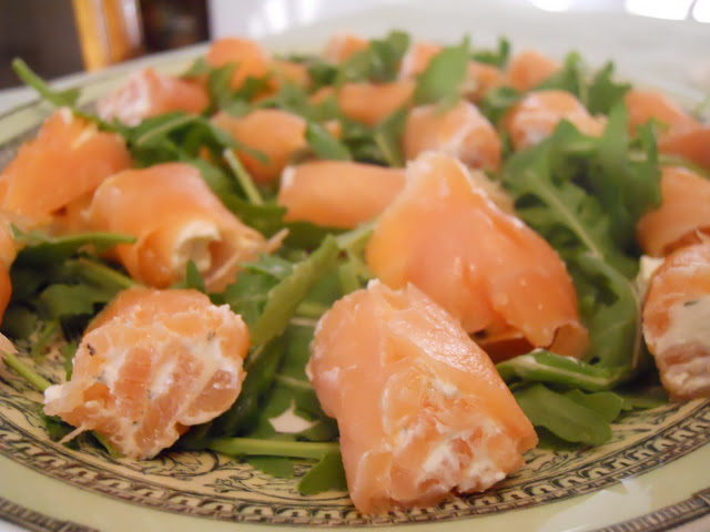 Tagliate il salmone a strisce larghe circa 4 cm, spalmate il formaggio, quindi disponete sopra ad ognuna le foglie di rucola e gli champignon, per poi arrotolarle creando degli involtini e fermateli con degli stecchini.